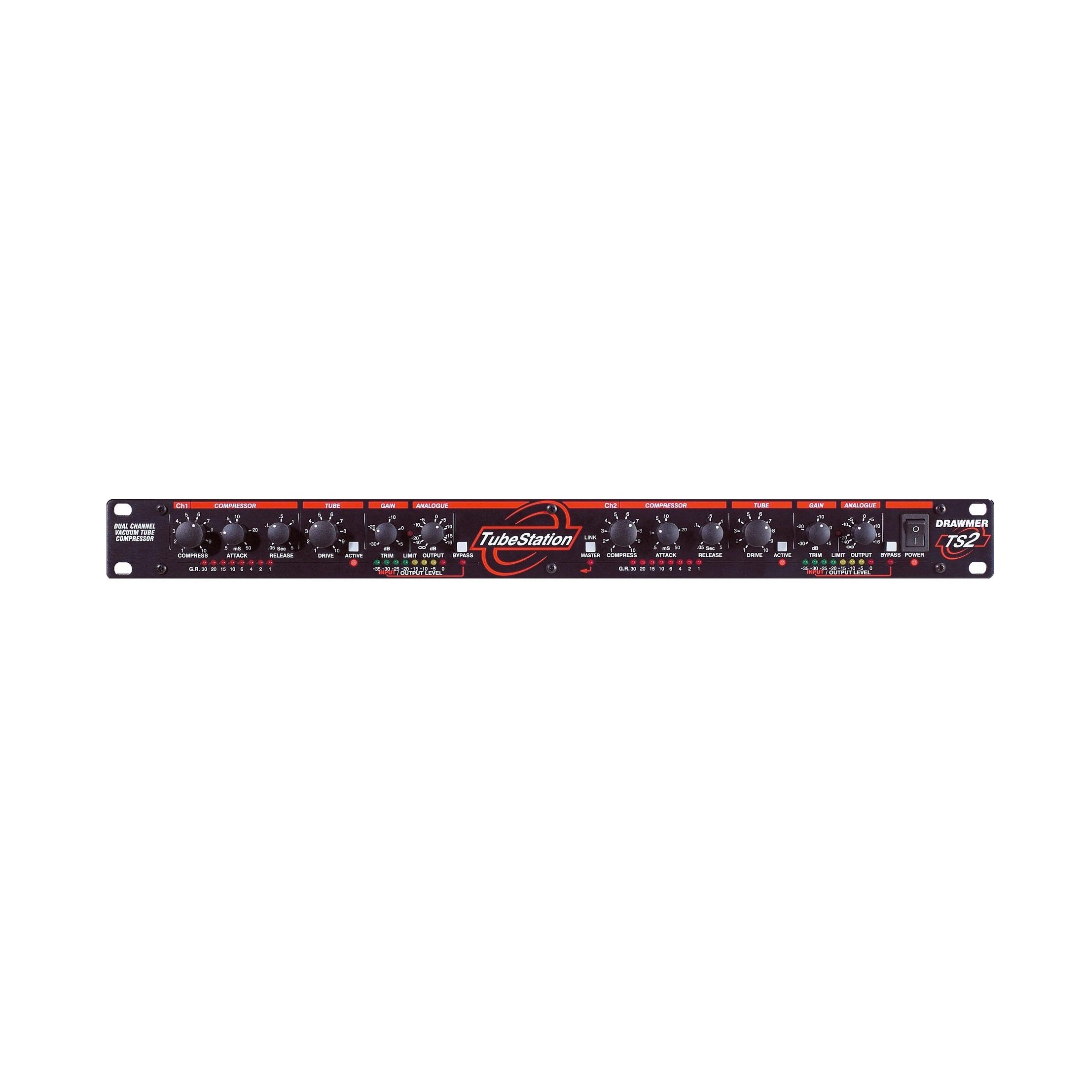 The Tube Station 2 (TS2) is a dual mono or stereo linkable soft-knee compressor. Each channel is equipped with a variable Tube Drive control which can be switched out of the signal path for instant A/B comparison. The TS2 offers digital outputs on SPDIF or AES/EBU at up to 24 bit resolution and 96K sample rate on the optional DC1 module. Simultaneous analogue outputs are available on balanced XLR..