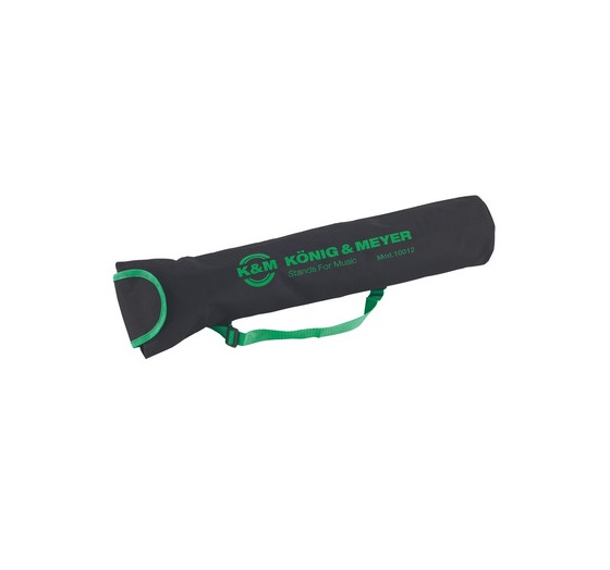 For music stands 100/1, 10062 and 10065. Waterproof nylon carrying case featuring velcro flap fastener and adjustable shoulder strap. Color: black with silk-screened K&M logo.