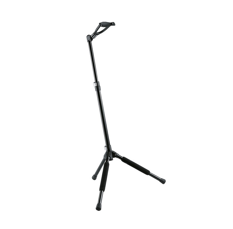 The collapsible guitar stand accommodates all kinds of guitars, banjos and basses. The height can be adjusted by an easy-to-use clamping lever. The stand is equipped with a locking mechanism to prevent turning, a solid and collapsible yoke construction with an additional safety strap and special foam pads to protect the finish of the guitar. Stable foot construction with reinforced base.
