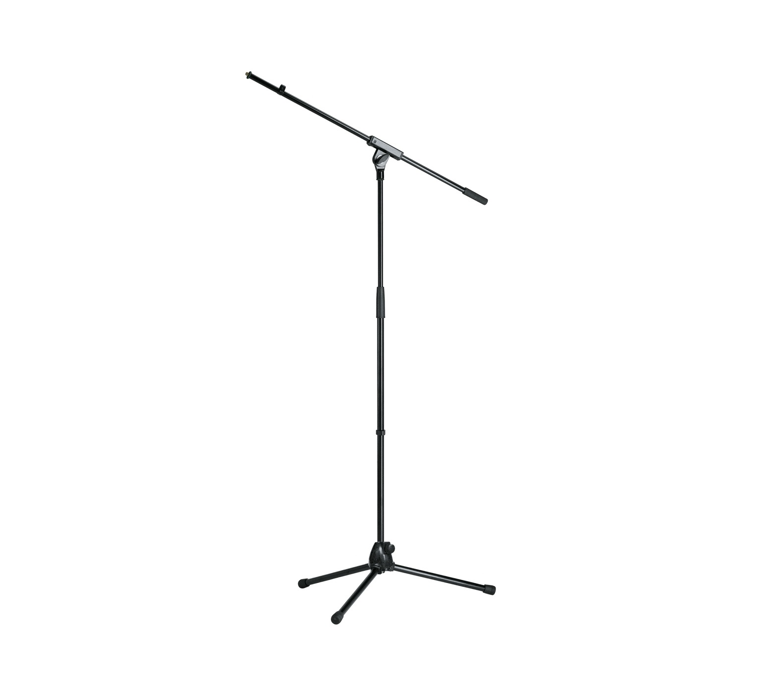 Low-priced all-metal-stand. Consists of tubing assembly, boom arm and zinc die-cast base with long folding legs. Square swivel joint with large wing nut.