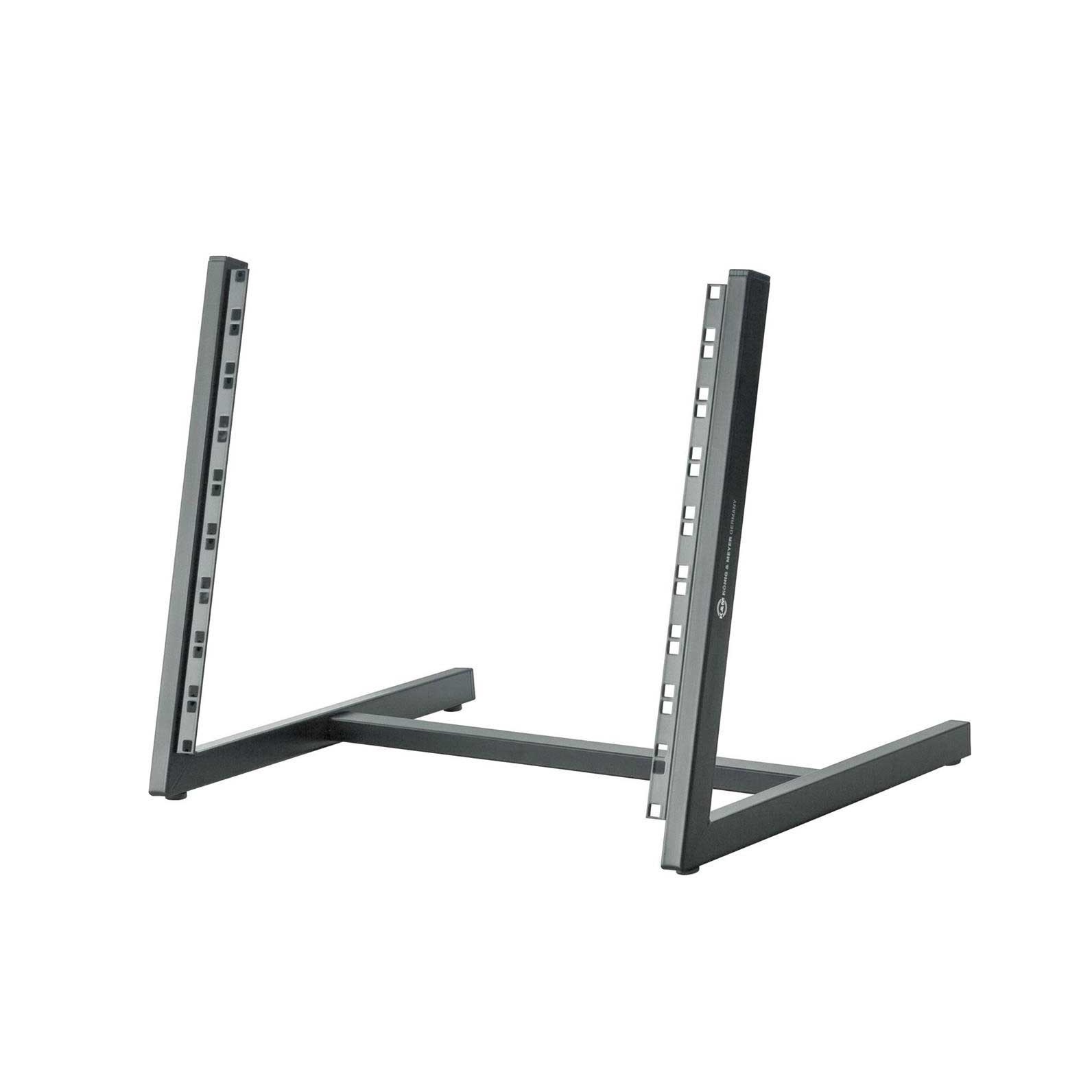 The K&M 40900 is a 19″ rack desk stand. This stand features a sturdy steel construction designed to hold 8 1RU space units. It also has a U-profile with steel rack rails and comes with 16 cage nuts and screws.
