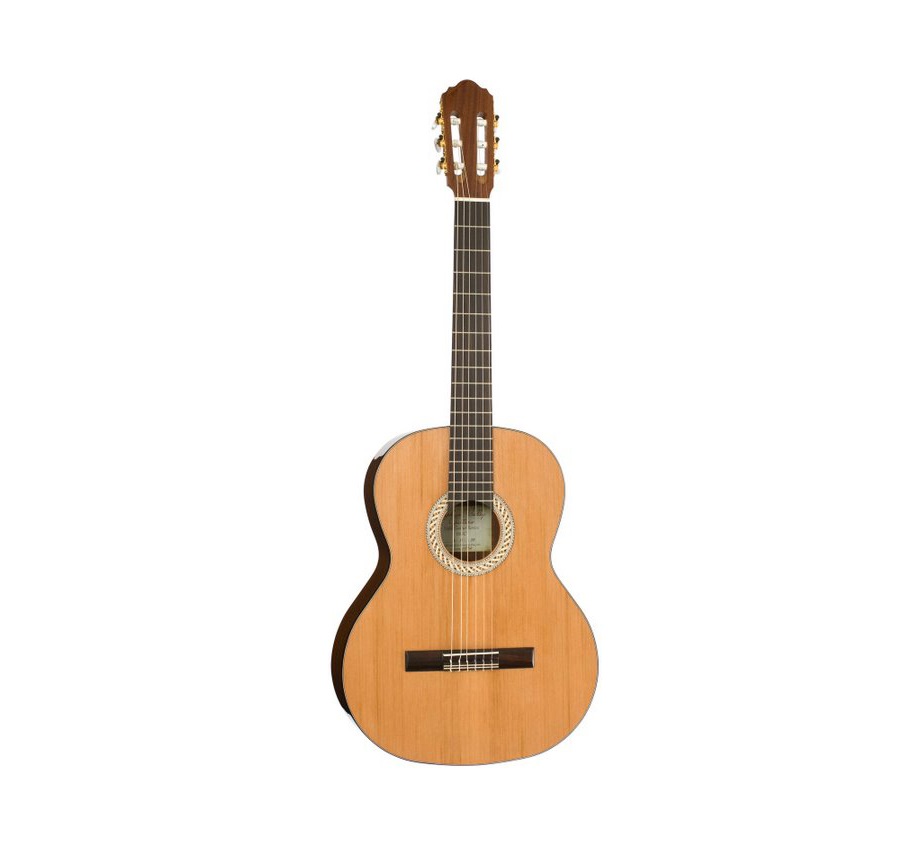 Red cedar solid top; Laminated sapelli back and sides; African mahogany neck; Indian Rosewood fingerboard & bridge; Wooden edging, purfling and rosette; Gloss polyurethane finish; Polymer nut and saddle; Gebr. Van Gent gold-plated machine heads; Set dovetail neck joint; Royal Classics “Kindersaiten” model Mid Tension Strings; 44 mm at nut; 19 frets; 480 mm scale.