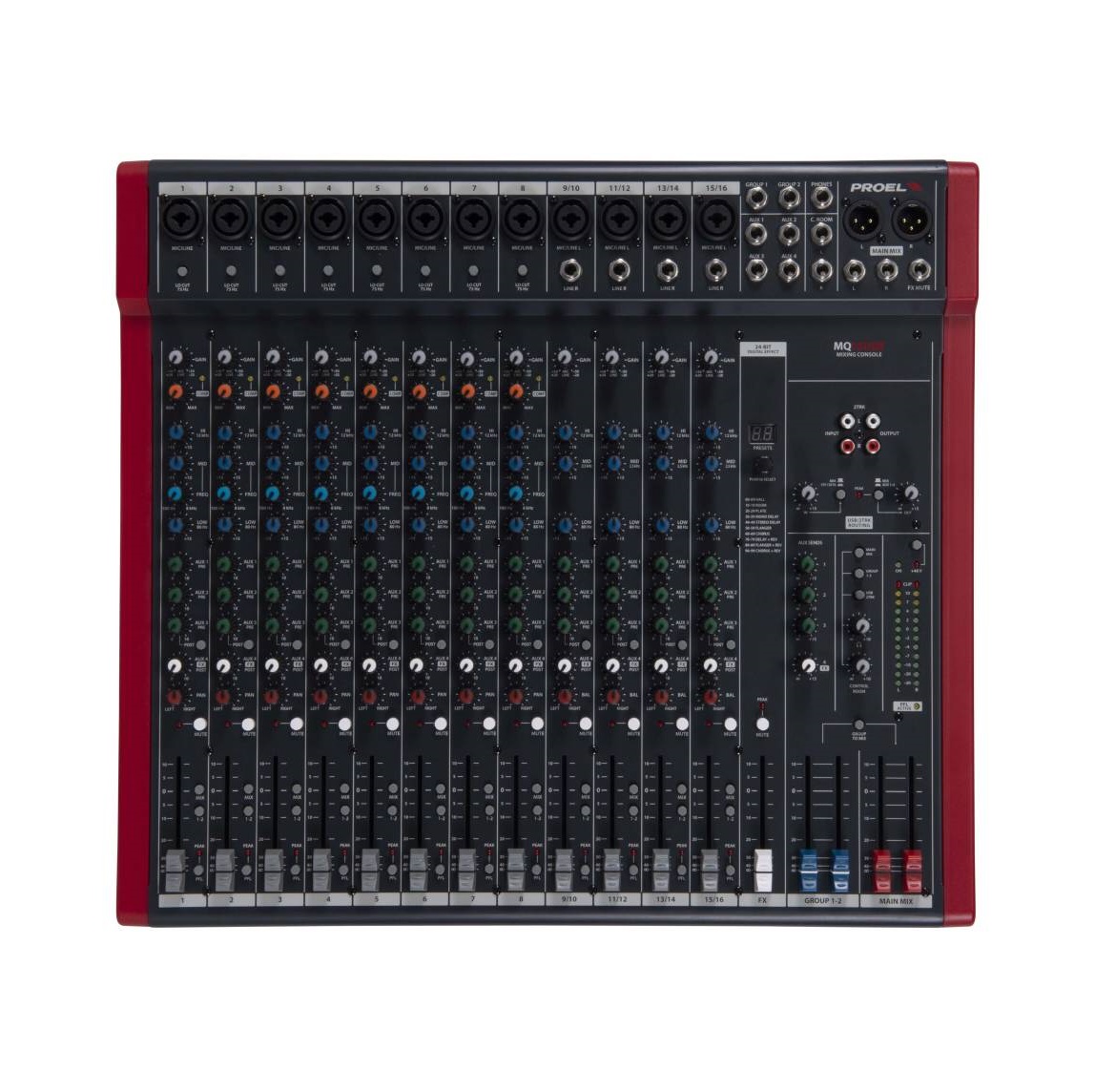 The top-of-the-line MQ16USB feature 16 inputs and 12 microphone channels together with sweep mids and one-knob intelligent COMPRESSORS on mono channels, 4 AUX sends, STEREO GROUP bus and 60mm control faders.
